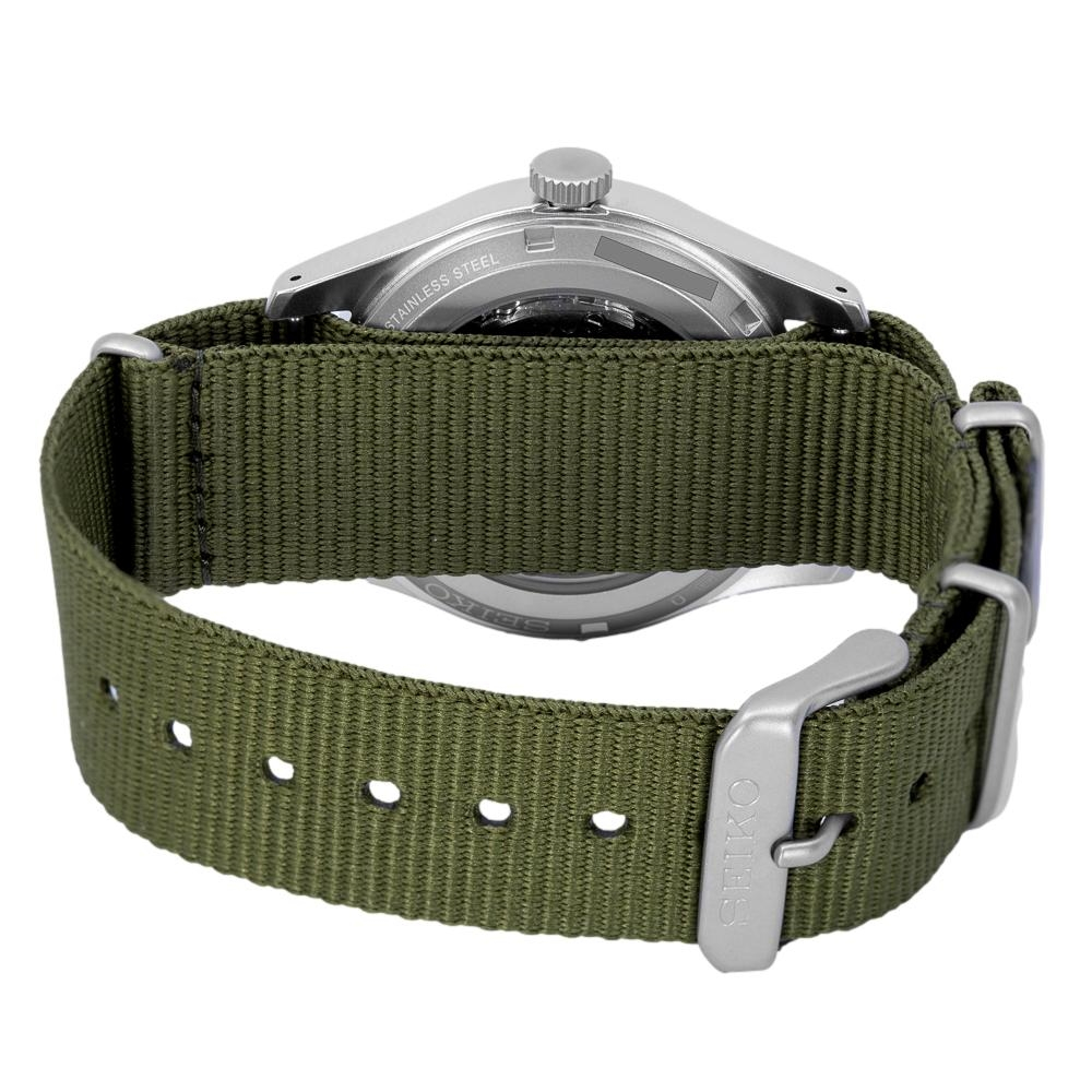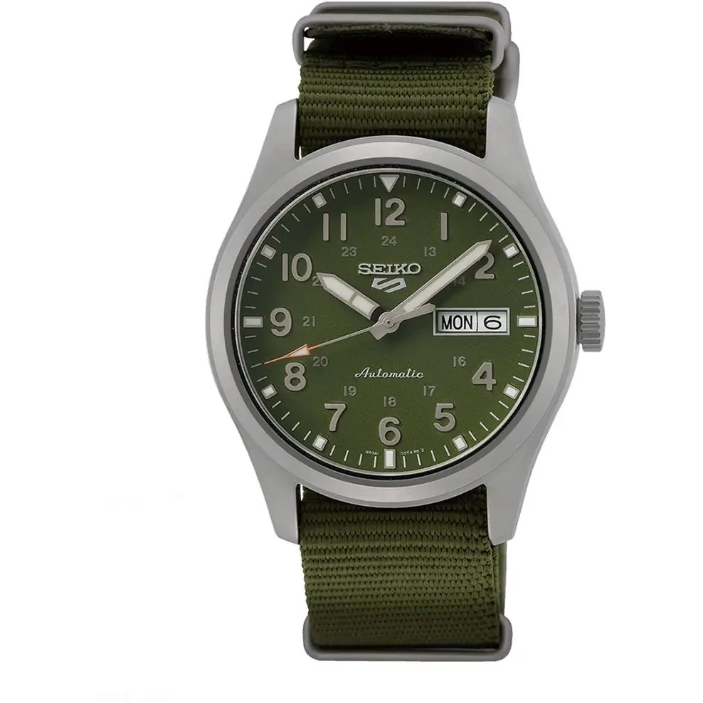 مدلی از سری Seiko 5 Sports Automatic با طراحی الهام‌گرفته از ساعت‌های میدانی (Field Watch). این مدل با صفحه سبز زیتونی، قاب استیل و موتور مکانیکی خودکار، ترکیبی از استایل اسپرت و کاربری روزمره رو ارائه می‌ده.