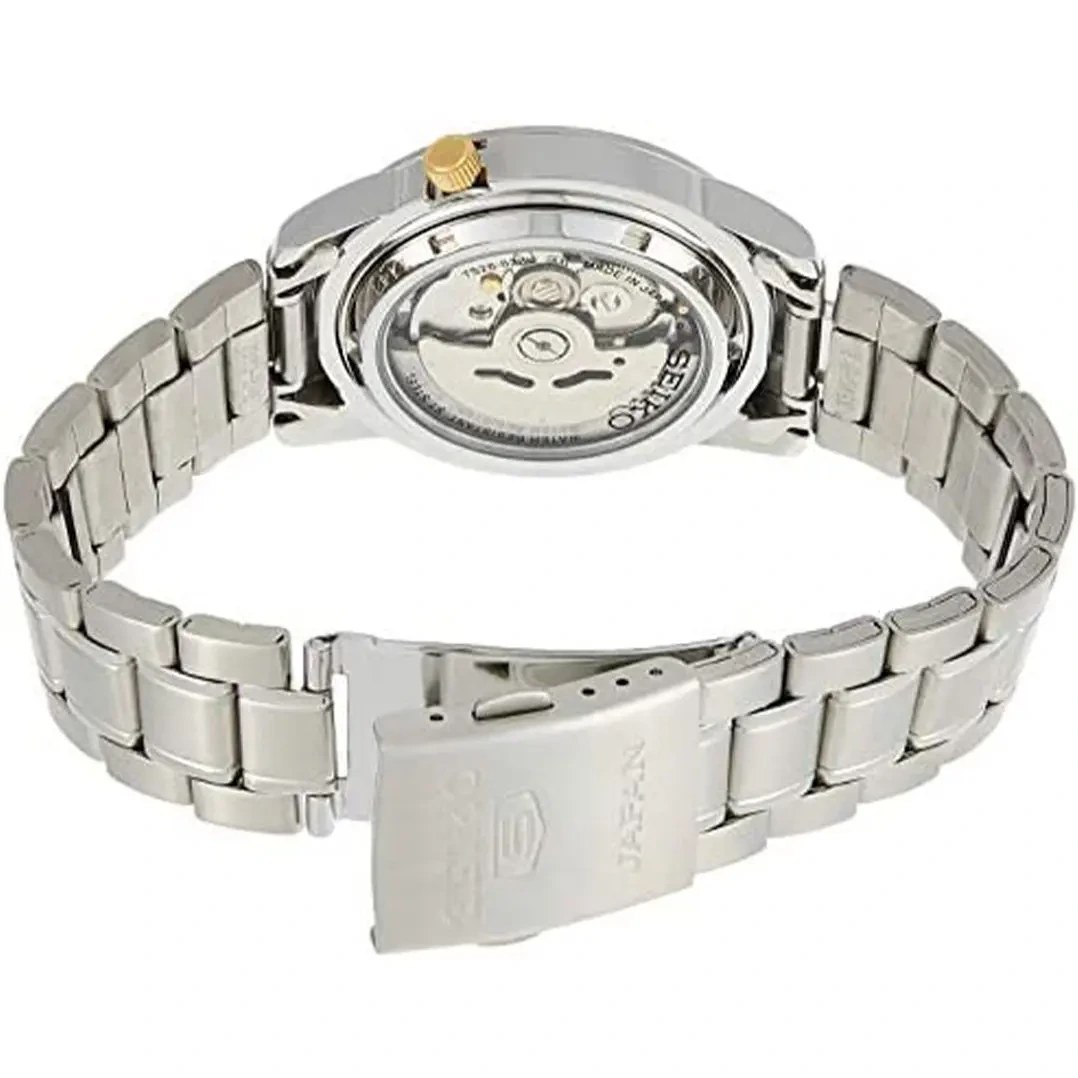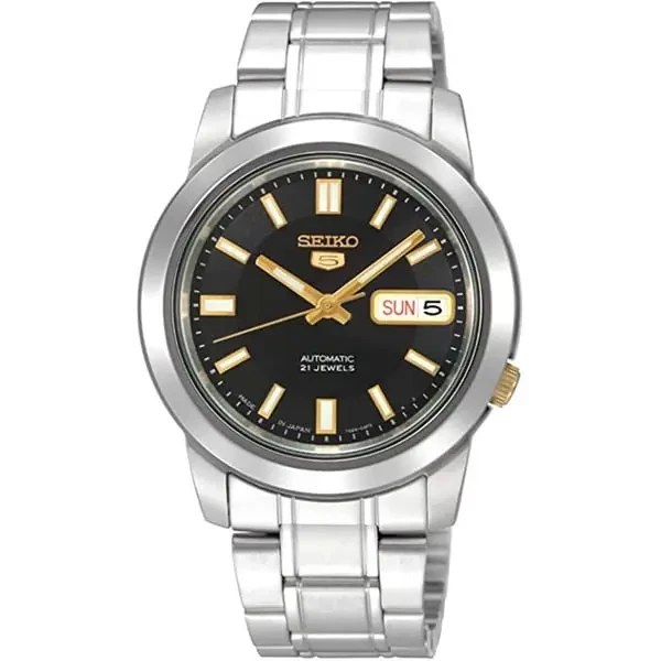 مدلی کلاسیک از سری Seiko 5 Automatic با طراحی ساده و موتور مکانیکی خودکار. این مدل با قاب استیل، بند فلزی و صفحه مشکی، برای استفاده روزمره و استایل‌های نیمه‌رسمی بسیار مناسب است.