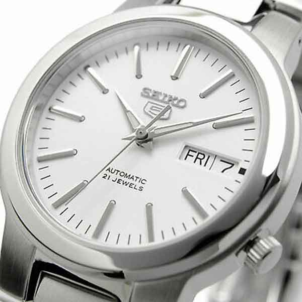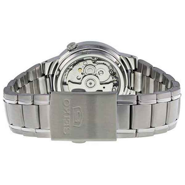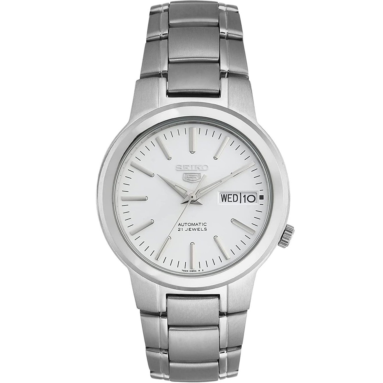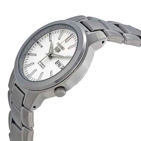 مدلی کلاسیک از سری Seiko 5 Automatic با طراحی ساده و موتور مکانیکی خودکار. این مدل با قاب استیل، بند فلزی و صفحه سفید، برای استفاده روزمره و استایل‌های نیمه‌رسمی بسیار مناسب است.