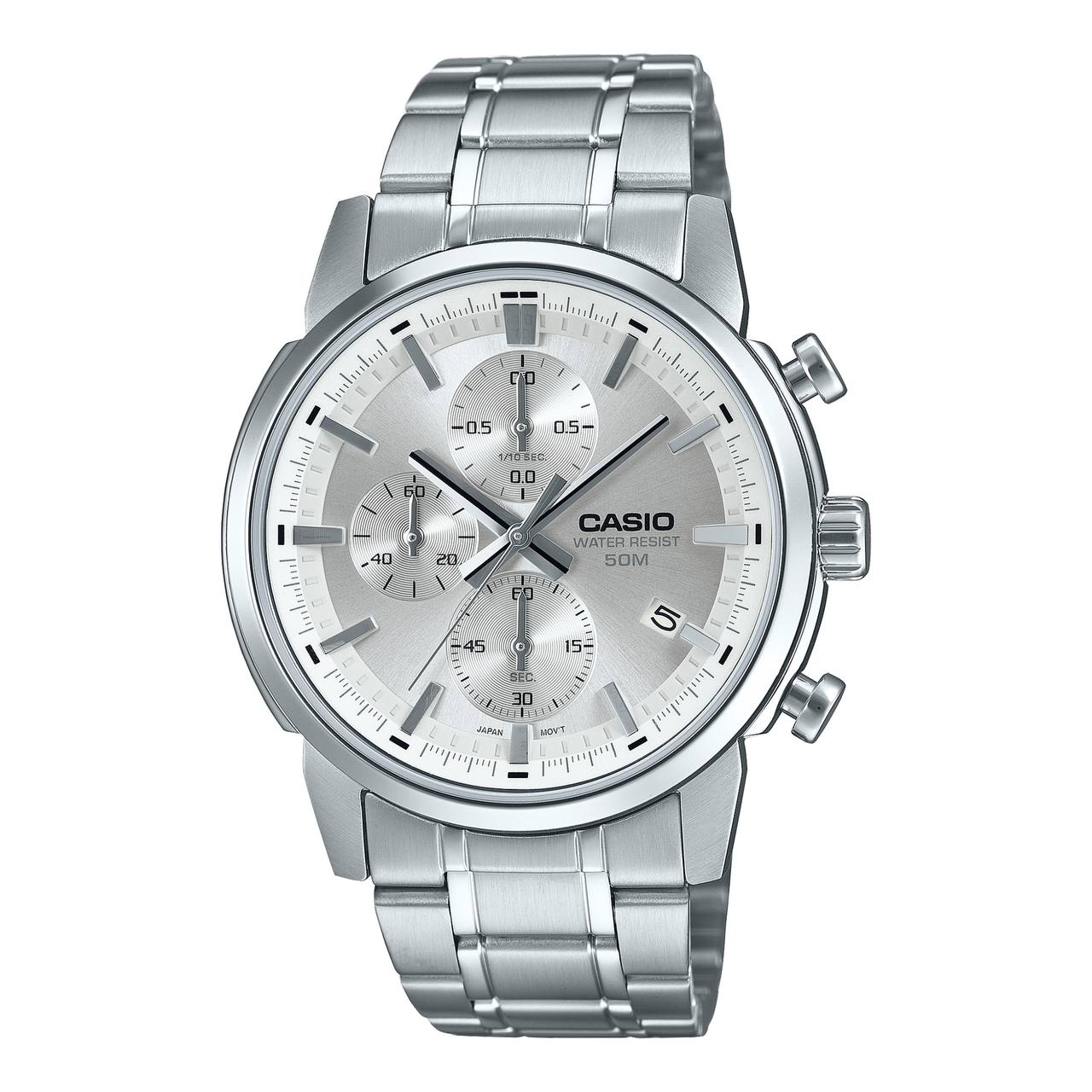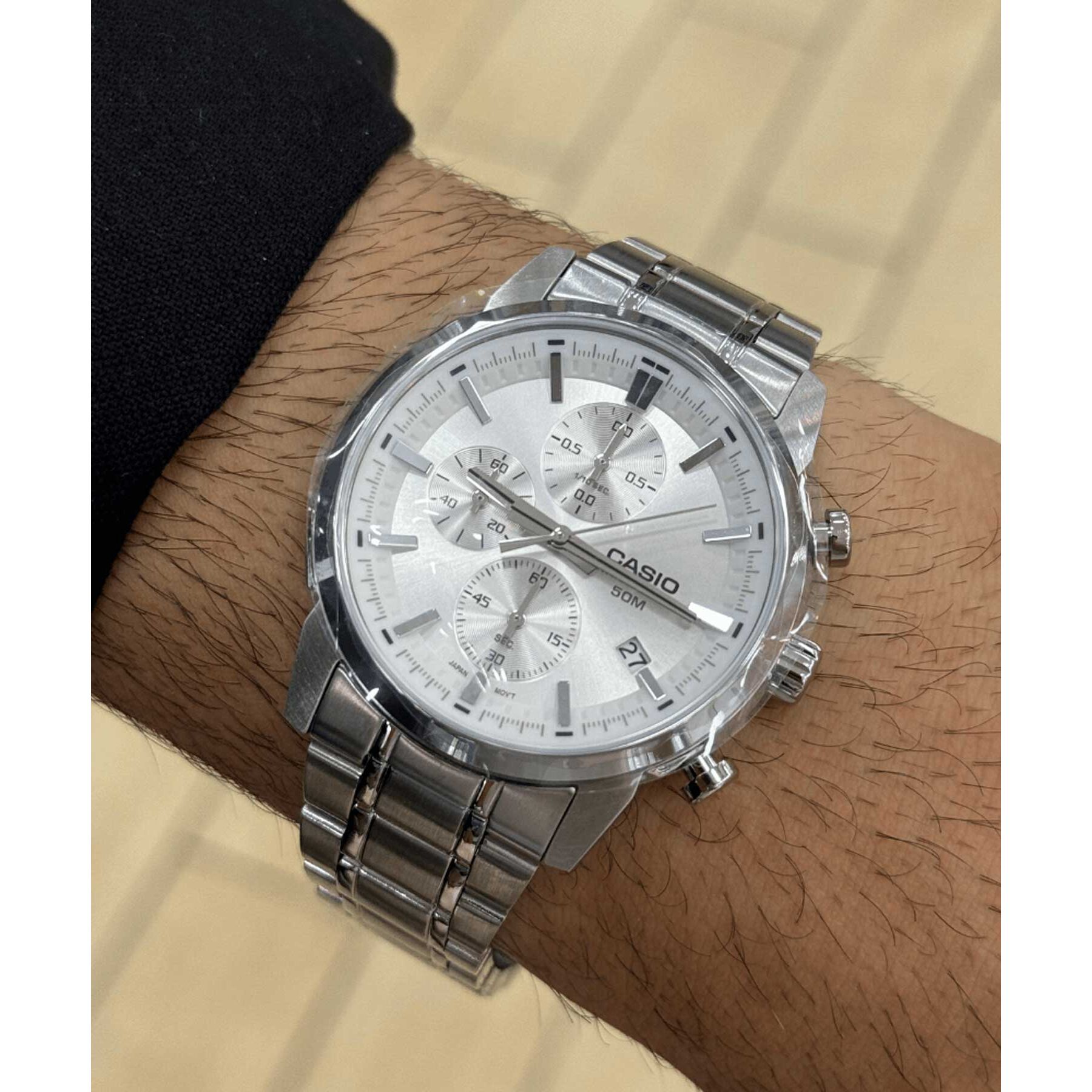 ساعت عقربه‌ای کاسیو مدل MTP-E510D-7AVDF با طراحی اسپرت و صفحه سفید مات، انتخابی شیک و کاربردی برای استایل‌های روزمره و رسمی است. سه صفحه فرعی کرونوگراف، عملکرد دقیق زمان‌سنجی را فراهم می‌کنند. بند استیل نقره‌ای و قاب فلزی ضدزنگ، دوام و زیبایی را هم‌زمان ارائه می‌دهد. مقاومت ۵۰ متر در برابر آب، استفاده روزانه را بدون نگرانی ممکن می‌سازد.