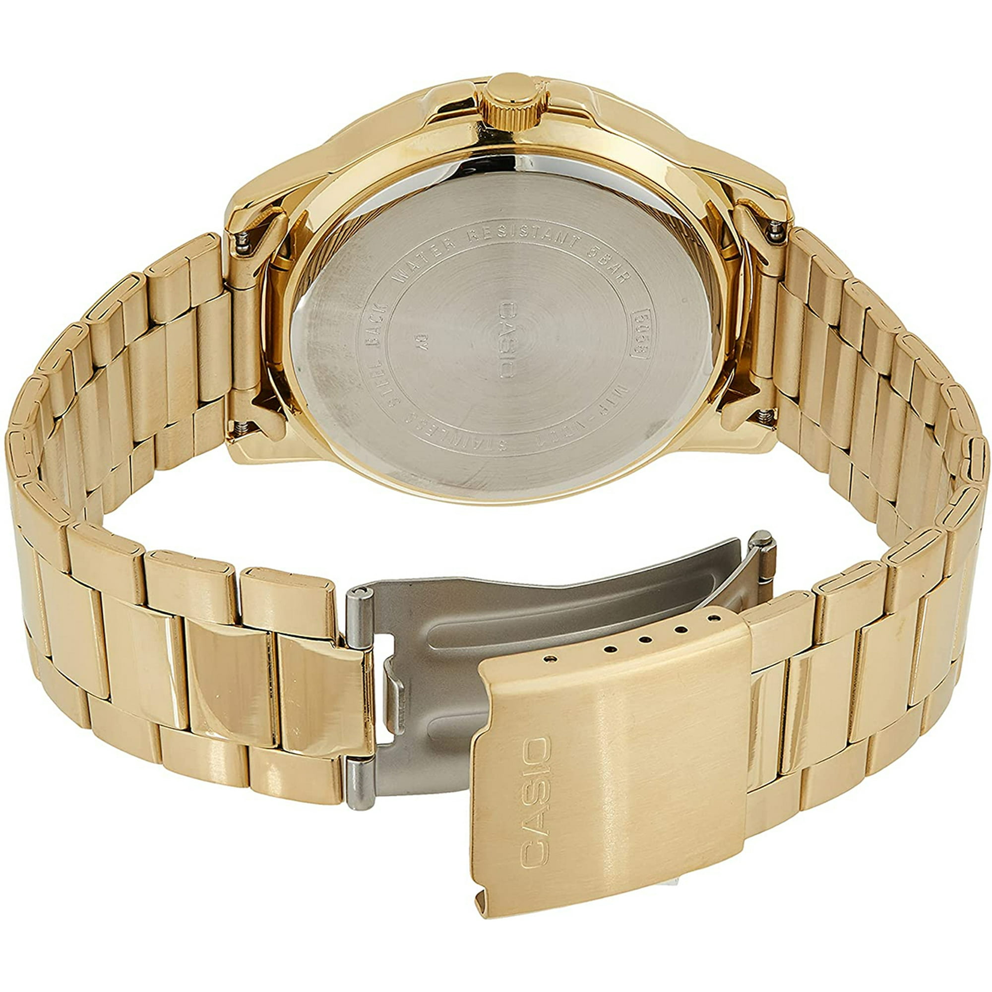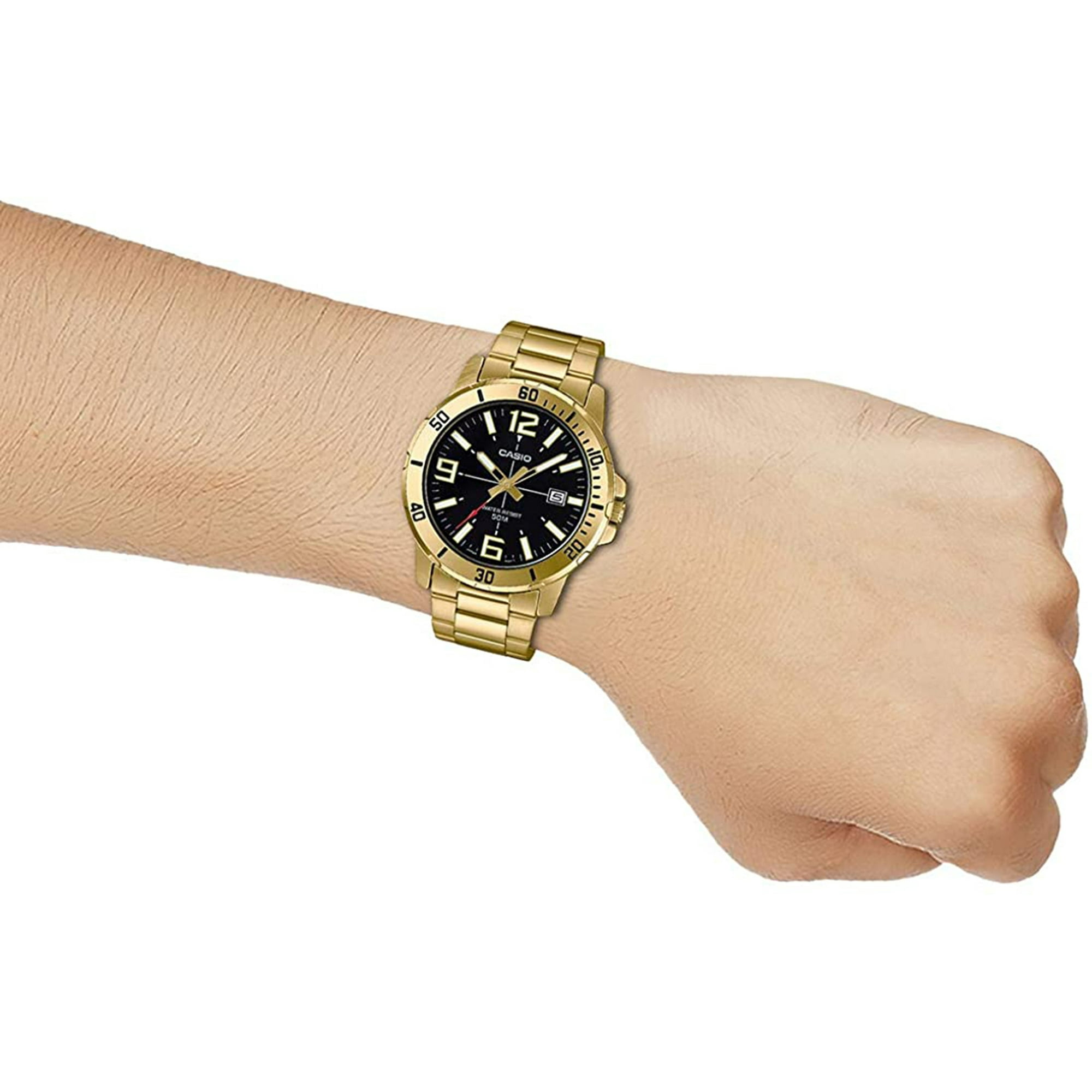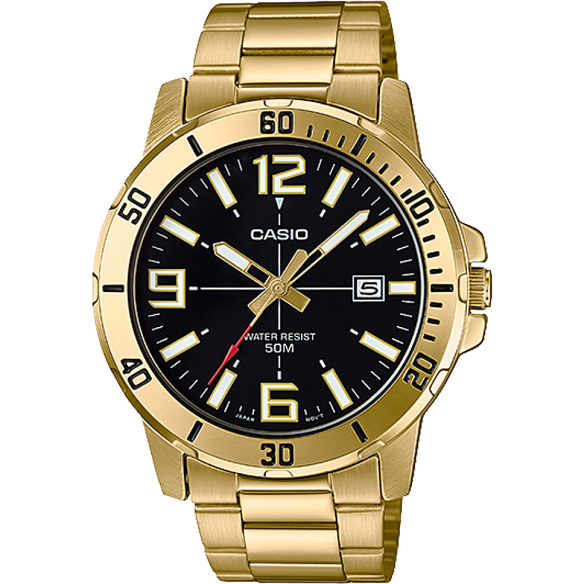 ساعت عقربهای کاسیو مدل MTP-VD01G-1BVUDF با طراحی اسپرت و رنگ طلایی، انتخابی جسورانه و لوکس برای استفاده روزمره و استایلهای رسمی است. صفحه مشکی مات با عقربههای خوانا و پنجره تاریخ در موقعیت ۳، جلوهای مدرن و کاربردی دارد. قاب و بند فلزی با پوشش یونپلیت طلایی، ظاهر ساعت را چشمگیر و متمایز کردهاند. مقاومت ۵۰ متر در برابر آب، استفاده روزانه را بدون نگرانی