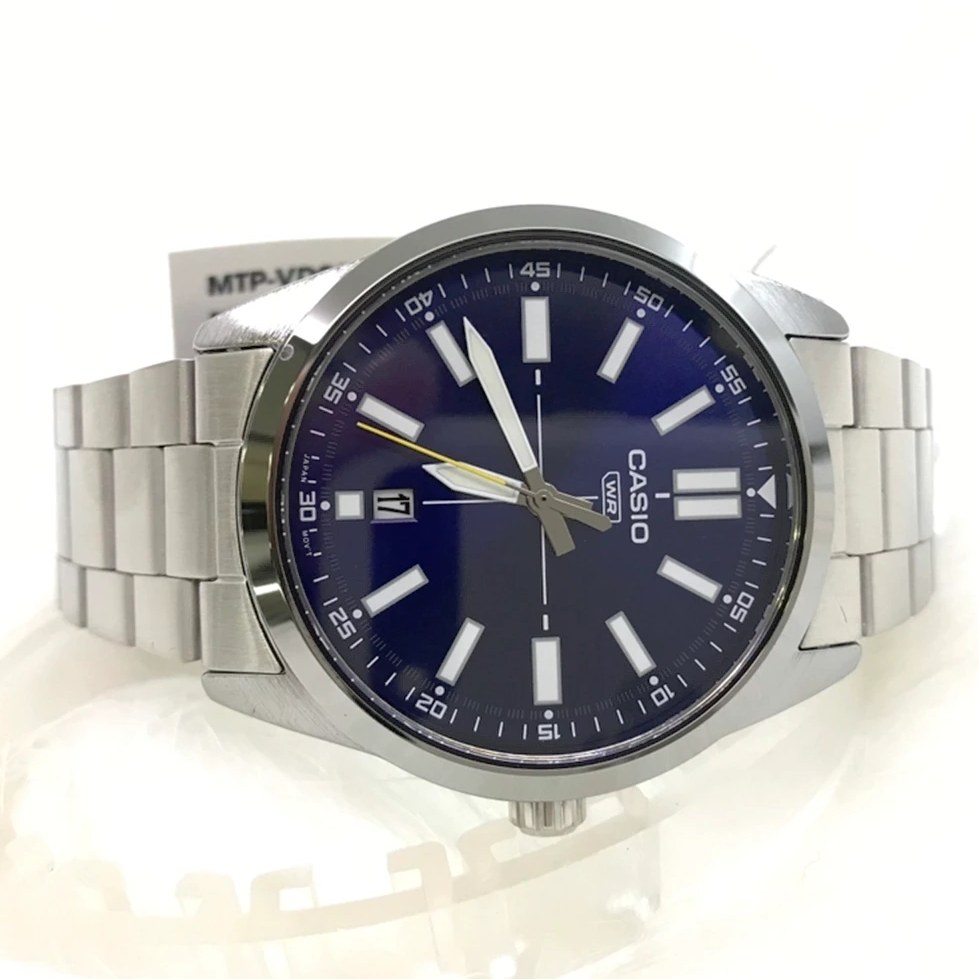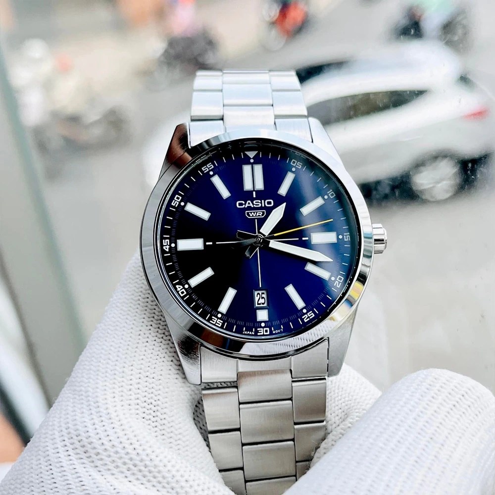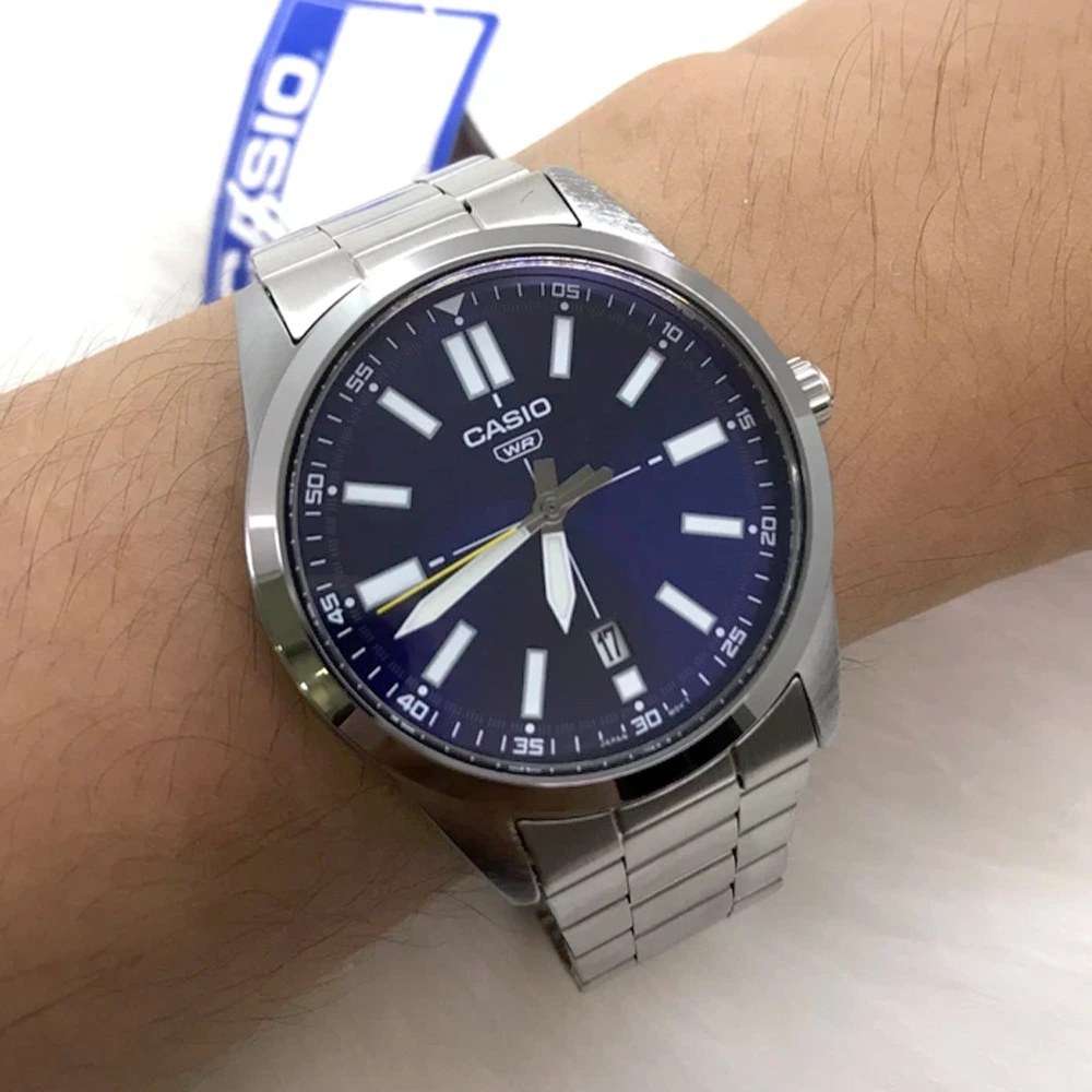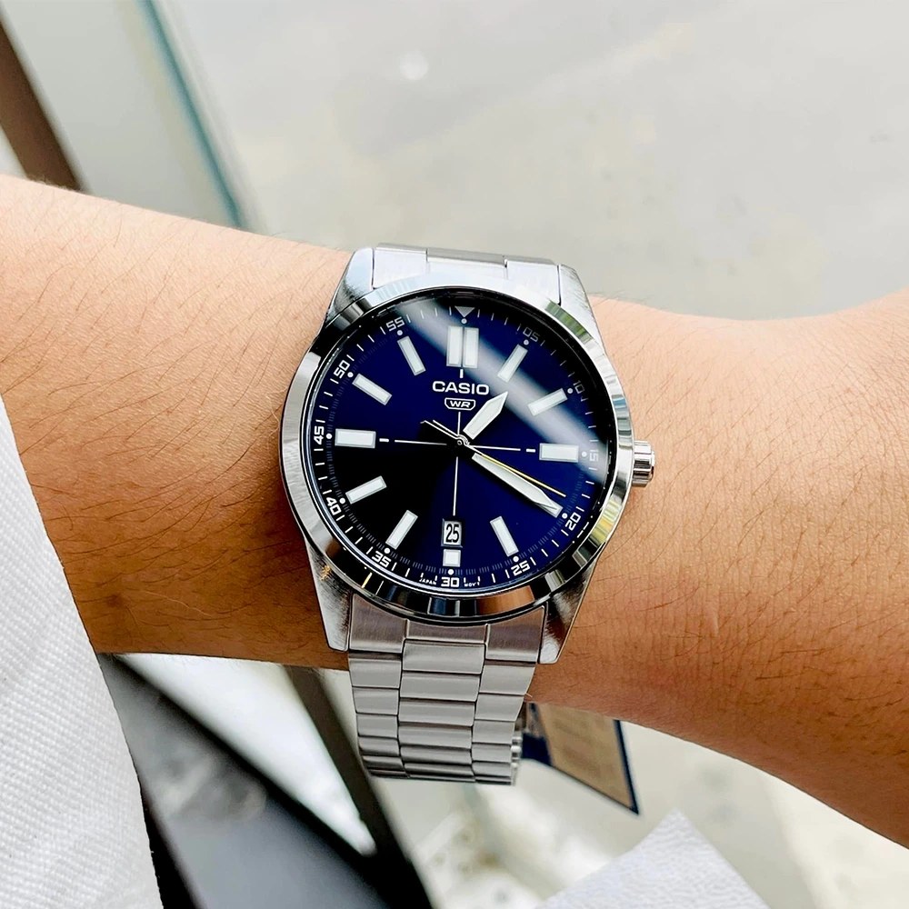 ساعت مچی عقربهای مردانه کاسیو مدل MTP-VD02D-2E با طراحی مینیمالیستی و کلاسیک، انتخابی شیک برای استایلهای روزمره و رسمی است. صفحه آبی با شاخصهای ساده و عقربههای دقیق در کنار بدنه و بند استیل نقرهای، جلوهای چشمنواز و مدرن دارد. این مدل با مقاومت نسبتاً خوب تا ۵۰ متر (5 ATM) و دقت متوسط ±20 ثانیه در ماه، مناسب استفاده روزانه است.