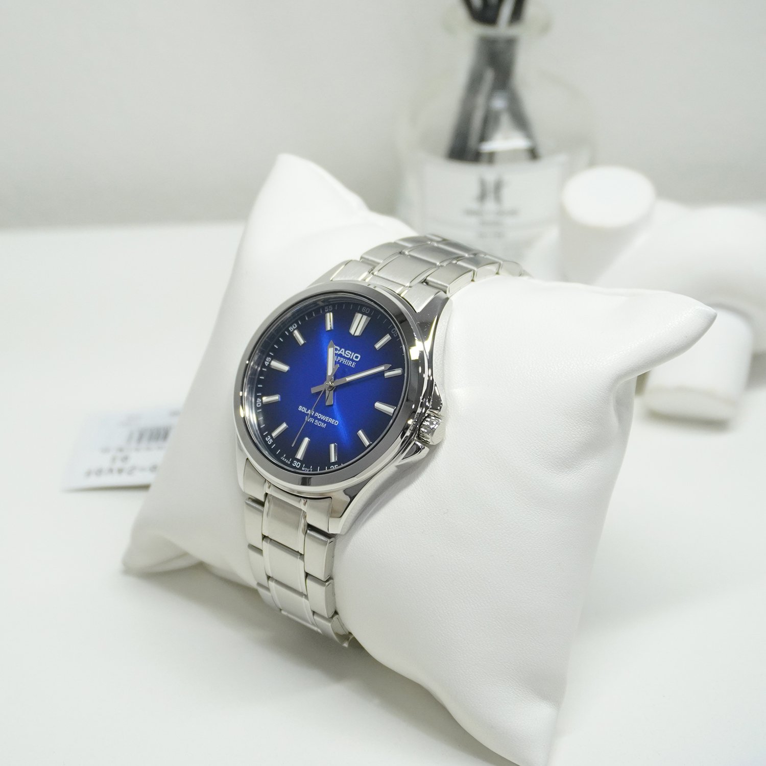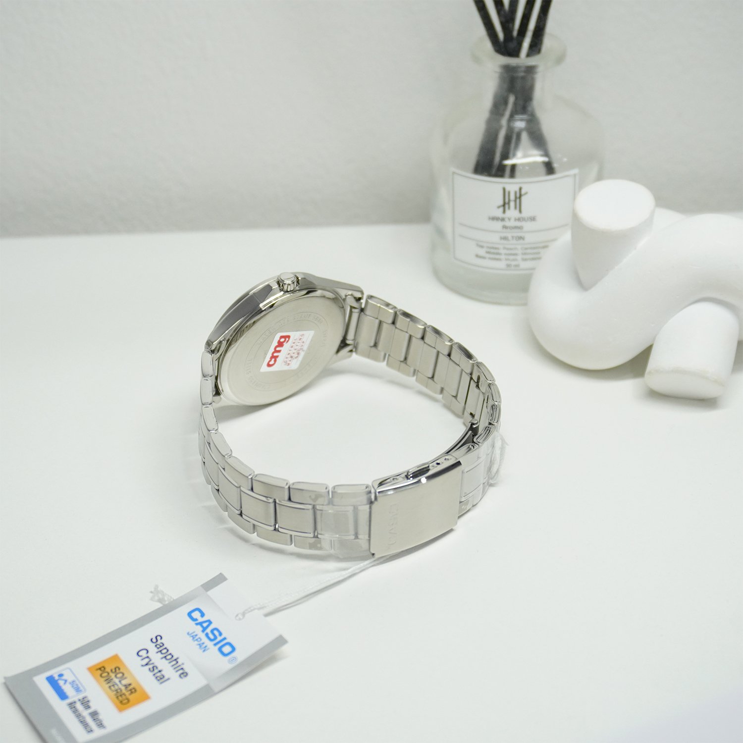ساعت عقربهای کاسیو مدل MTS-RS100D-2A با طراحی ساده، شیک و عملکرد خورشیدی، انتخابی هوشمندانه برای آقایانی است که به استایلهای رسمی، نیمهرسمی و روزمره علاقه دارند. صفحه آبی با عقربههای نقرهای و پنجره تاریخ در موقعیت ساعت ۳، جلوهای خوانا و کاربردی دارد. شیشه یاقوتی ضدخش با پوشش ضدبازتاب، دوام و وضوح بالایی را فراهم میکند. قاب و بند استیل نقرهای با پرداخت مات و براق، ظاهری حرفهای و مقاوم دارد. ابعاد بدنه ۴۷×۴۱.۷ میلیمتر با ضخامت ۹.۵ میلیمتر، برای مچهای متوسط تا بزرگ مناسب است. نوع قفل بند «کلیپسه سهتایی با باز شدن سریع» (One-touch 3-fold clasp) است که هم ایمنی دارد و هم استفاده آسان.
