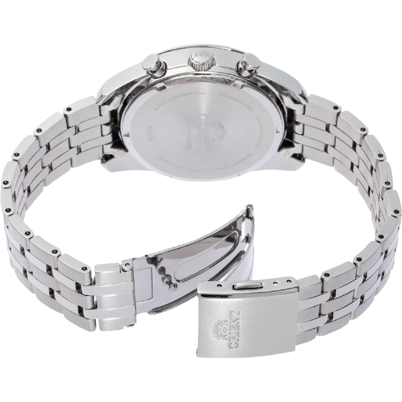 این ساعت از برند معتبر اورینت ژاپن، با طراحی کلاسیک و مدرن و فناوری خورشیدی (سولار) پیشرفته، انتخابی ایده‌آل برای مردانی است که به دنبال ترکیبی از ظریف‌ترین فناوری، دقت و پایداری هستند. صفحه مشکی با نشانگرهای نقره‌ای و زیرشاخه‌های کرنوگراف، زیبایی چشمگیری ایجاد می‌کند، در حالی که بند چرم طبیعی، راحتی و دوام را تضمین می‌کند. موتور خورشیدی کالیبر VJ45 با قابلیت ذخیره انرژی تا ۶ ماه، نیاز به تعویض باتری را برطرف کرده و عملکردی بی‌نقص را تضمین میکند. این ساعت با طراحی خاص خود، برای استفاده روزمره و مناسبت‌های نیمه رسمی ایده‌آل است. اورینت با بیش از نیم قرن تجربه در تولید ساعت‌های مکانیکی و الکترونیکی، تضمینی بر کیفیت و اصالت این محصول است