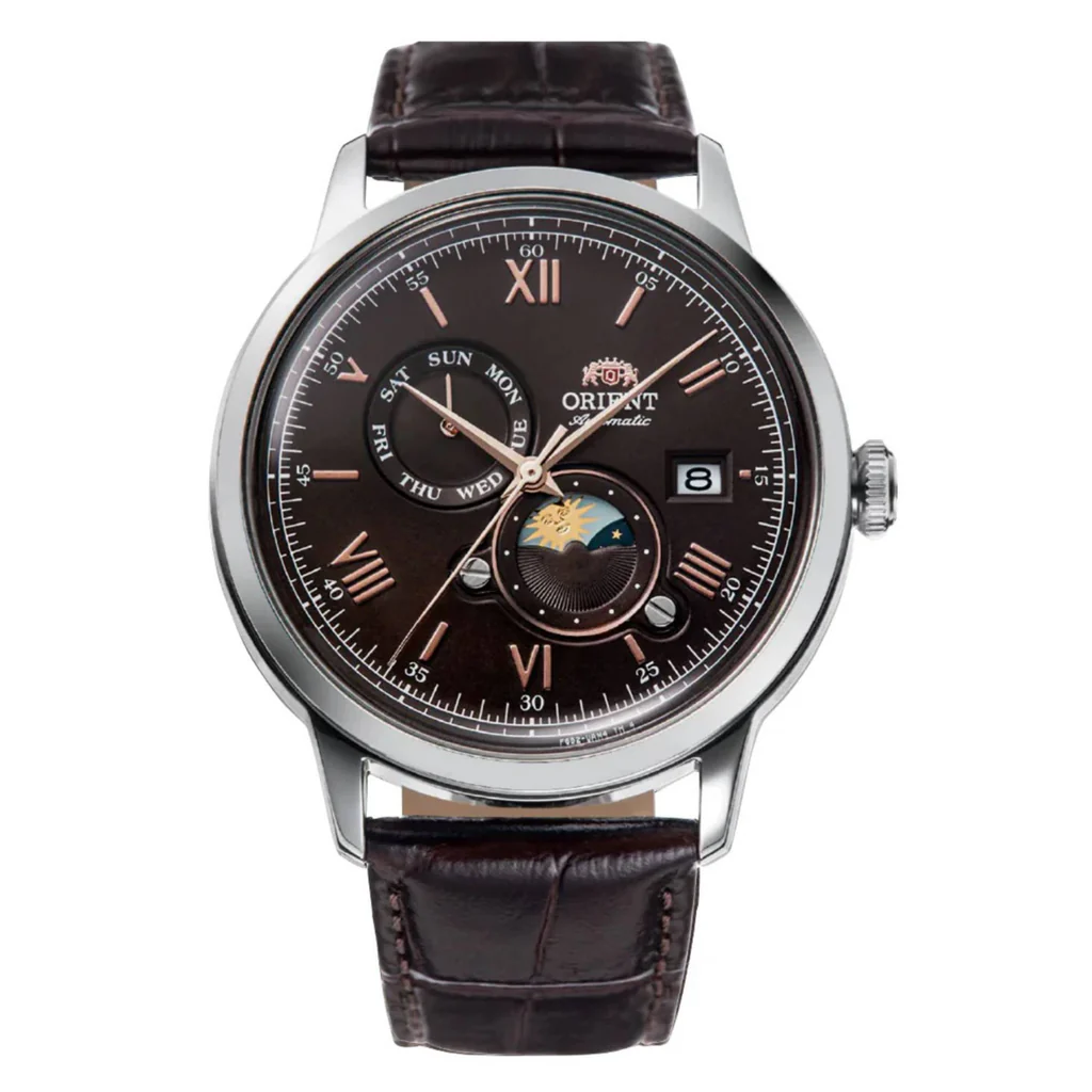 این ساعت از مجموعه Bambino Version 9 برند اورینت ژاپن، با طراحی کلاسیک و مدرن و نشانگر منحصر به فرد خورشید و ماه، انتخابی ایده‌آل برای مردانی است که به دنبال ترکیبی از اصالت، دقت و زیبایی هستند. صفحه قهوه‌ای با اثر سانبرست و نشانگرهای نقره‌ای، زیبایی چشمگیری ایجاد می‌کند، در حالی که بند چرم طبیعی با سگک، راحتی و دوام را تضمین می‌کند. موتور اتوماتیک ژاپنی کالیبر F6B24 با قابلیت کوک خودکار و دستی، قدرت ذخیره ۴۰ ساعته و دقت بین +۲۵ تا -۱۵ ثانیه در روز را ارائه می‌دهد. این ساعت با طراحی خاص خود، برای مناسبت‌های رسمی و استفاده روزمره ایده‌آل است. اورینت با بیش از نیم قرن تجربه در تولید ساعت‌های مکانیکی، تضمینی بر کیفیت و اصالت این محصول است.