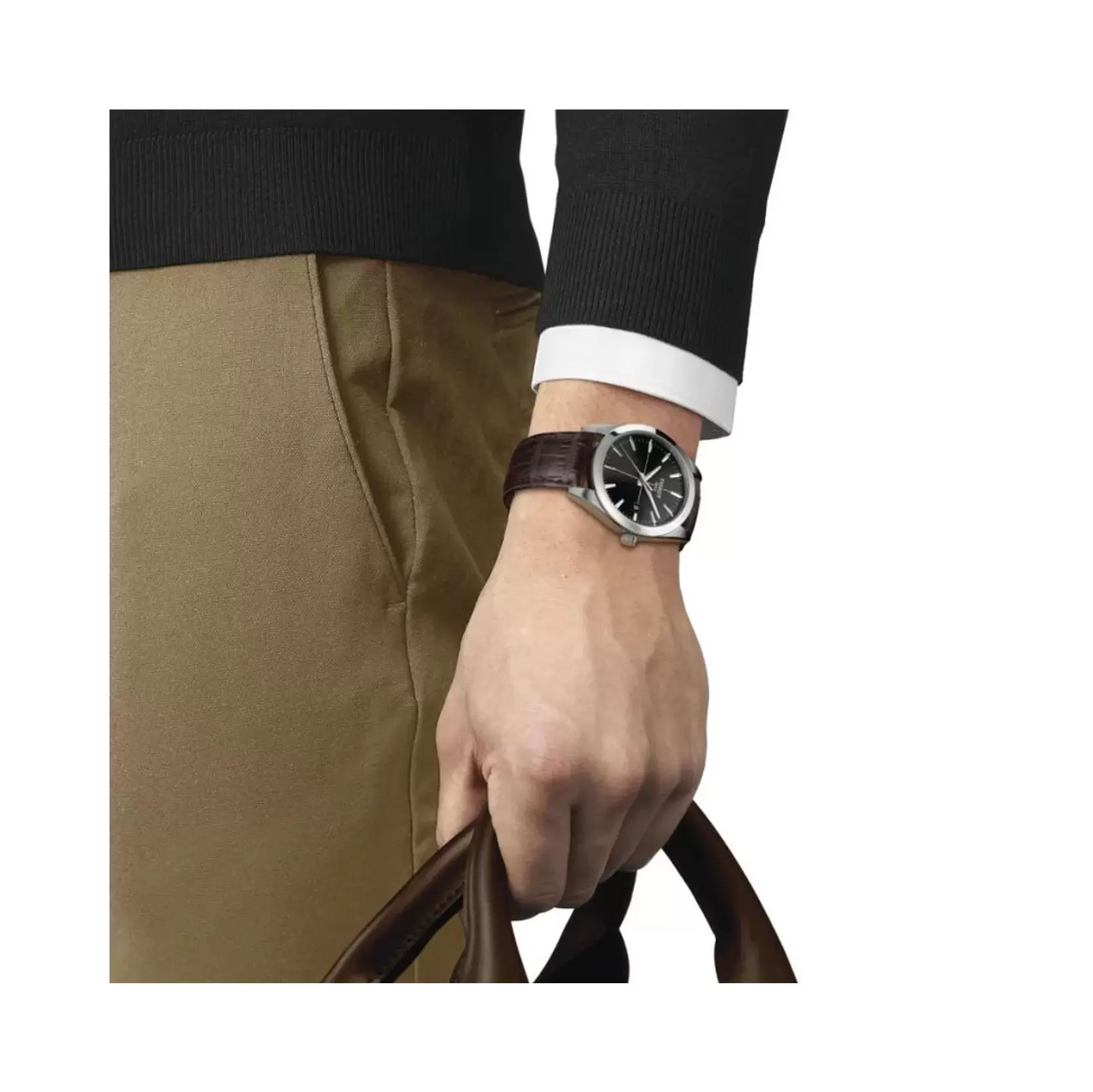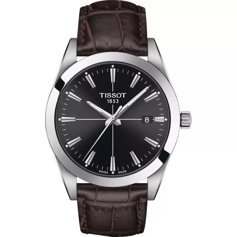 ساعت Tissot Gentleman مدل T1274101605101 با بند چرمی قهوهای و قاب استیل صیقلی، ظاهری گرم و رسمی دارد که بهراحتی با استایلهای کلاسیک و نیمهرسمی هماهنگ میشود. صفحه مشکی با جلوه آفتابگردان و عقربههای شبتاب، خوانایی بالا و جلوهای مدرن را فراهم میکند.