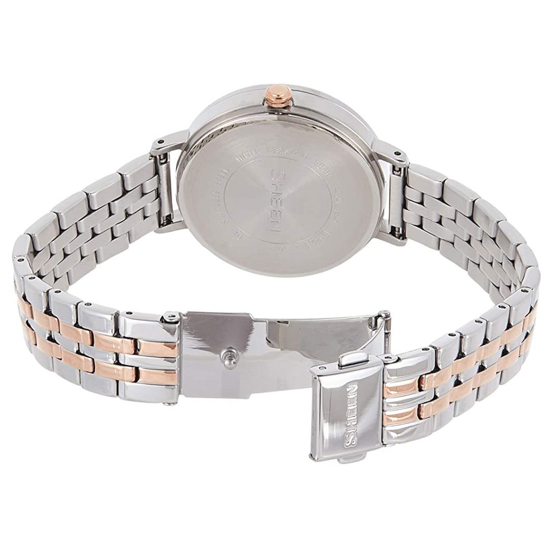 ساعت زنانه کاسیو مدل SHE-3064SPG-7AVDF از سری شِین (SHEEN)، با طراحی ظریف و ترکیب رنگ رزگلد و نقرهای، انتخابی لوکس و مدرن برای بانوانی است که به استایلهای رسمی، مجلسی و روزمره شیک علاقه دارند. صفحه سفید صدفی با جزئیات رزگلد و سه سابدایال کاربردی برای نمایش روز، تاریخ و ساعت ۲۴، جلوهای خوانا و چندمنظوره دارد. قاب استیل با پوشش یونپلیت رزگلد و بند استیل دو رنگ، ترکیبی از زیبایی، دوام و راحتی را ارائه میدهد. شیشه معدنی با پوشش ضدبازتاب و مقاومت ۵۰ متر در برابر آب، استفاده روزمره را بدون نگرانی