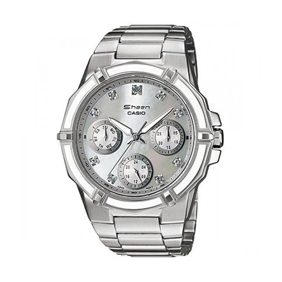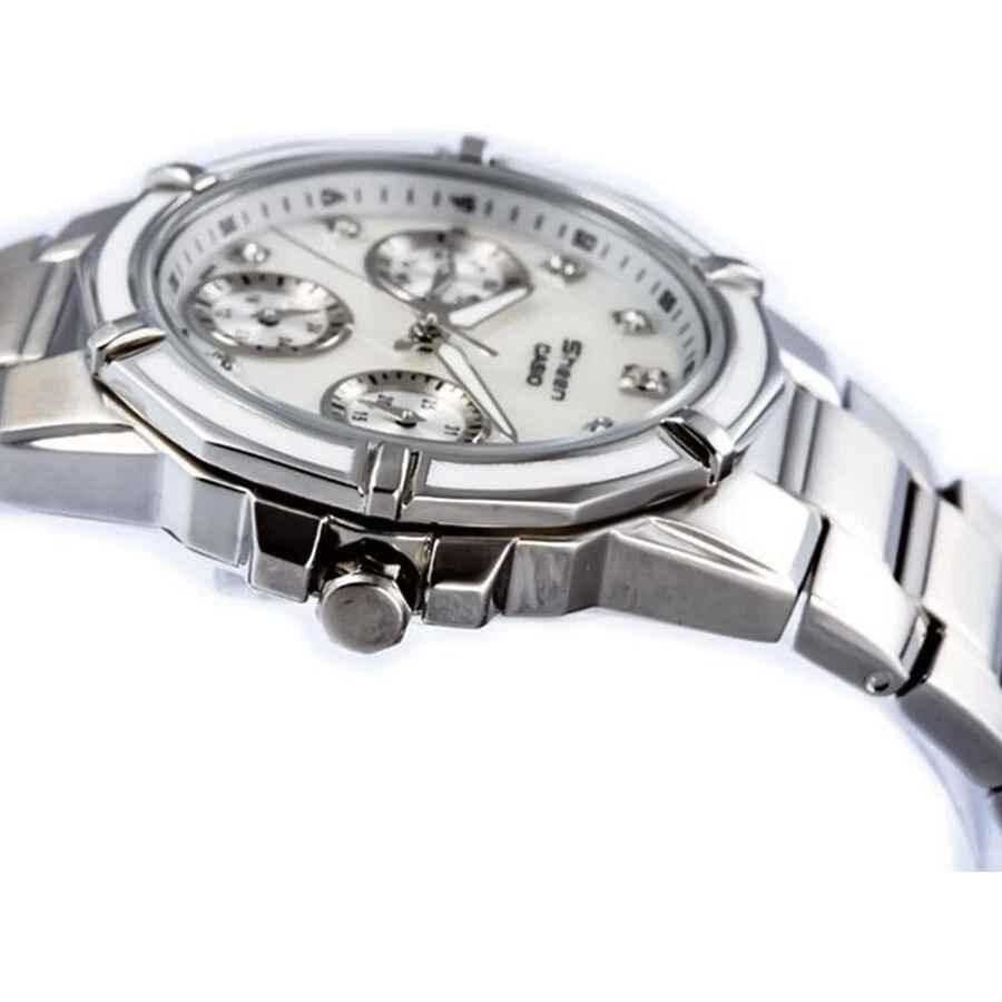 ساعت زنانه کاسیو مدل SHN-301 با طراحی کلاسیک و عملکرد چندموتوره، انتخابی شیک و کاربردی برای بانوانی است که به استایلهای رسمی، روزمره و مجلسی علاقه دارند. صفحه سفید یا نقرهای با جزئیات ظریف و سه سابدایال برای نمایش روز، تاریخ و ساعت ۲۴، جلوهای خوانا و چندمنظوره دارد. قاب و بند استیل با پرداخت براق و یونپلیت مشکی یا نقرهای، ترکیبی از زیبایی و دوام را ارائه میدهد. شیشه معدنی تراشخورده (Cut Glass) با پوشش ضدبازتاب، وضوح و جلوهای لوکس به ساعت میبخشد. مقاومت در برابر آب تا ۵۰ متر، استفاده روزمره را بدون نگرانی ممکن میسازد.