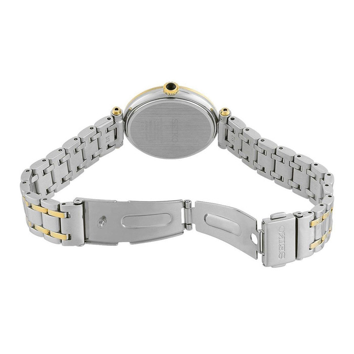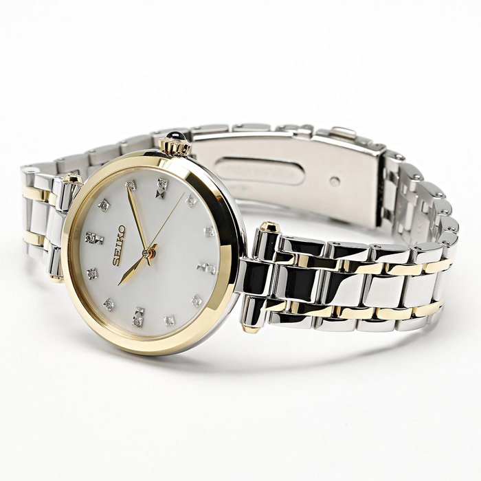 ساعت مچی زنانه سیکو (Seiko) مدل SRZ532P1 این ساعت از مجموعه Conceptual برند سیکو، یک مدل ظریف، کلاسیک و مجلسی برای بانوان است که با طراحی دوتیکه و جزئیات لوکس خود جلوه‌ی خاصی دارد. ویژگی‌های طراحی و ظاهری: طرح صفحه: صفحه‌ی اصلی این مدل از صدف مادر (Mother of Pearl) ساخته شده که با تابش نور، رنگ‌ها و انعکاس‌های زیبا و منحصربه‌فردی ایجاد می‌کند. تزئینات: روی صفحه، ۱۲ عدد الماس به عنوان نشانگرهای ساعت کار گذاشته شده‌اند که بر جنبه‌ی لوکس و درخشان ساعت می‌افزایند. بند: بند آن از فولاد ضدزنگ و مجهز به قفل سه‌تایی با دکمه (Three-fold clasp with push button) است که علاوه بر امنیت، باز و بسته کردن آن را بسیار آسان می‌کند. گارانتی: این محصول معمولاً با گارانتی بین‌المللی ۳ ساله شرکت سیکو عرضه می‌شود. این ساعت به‌دلیل طراحی کلاسیک و همیشه مدورش، برای استفاده در محیط‌های کاری، مهمانی‌ها و به‌عنوان یک هدیه‌ی لوکس و ماندگار گزینه‌ی بسیار مناسبی است.