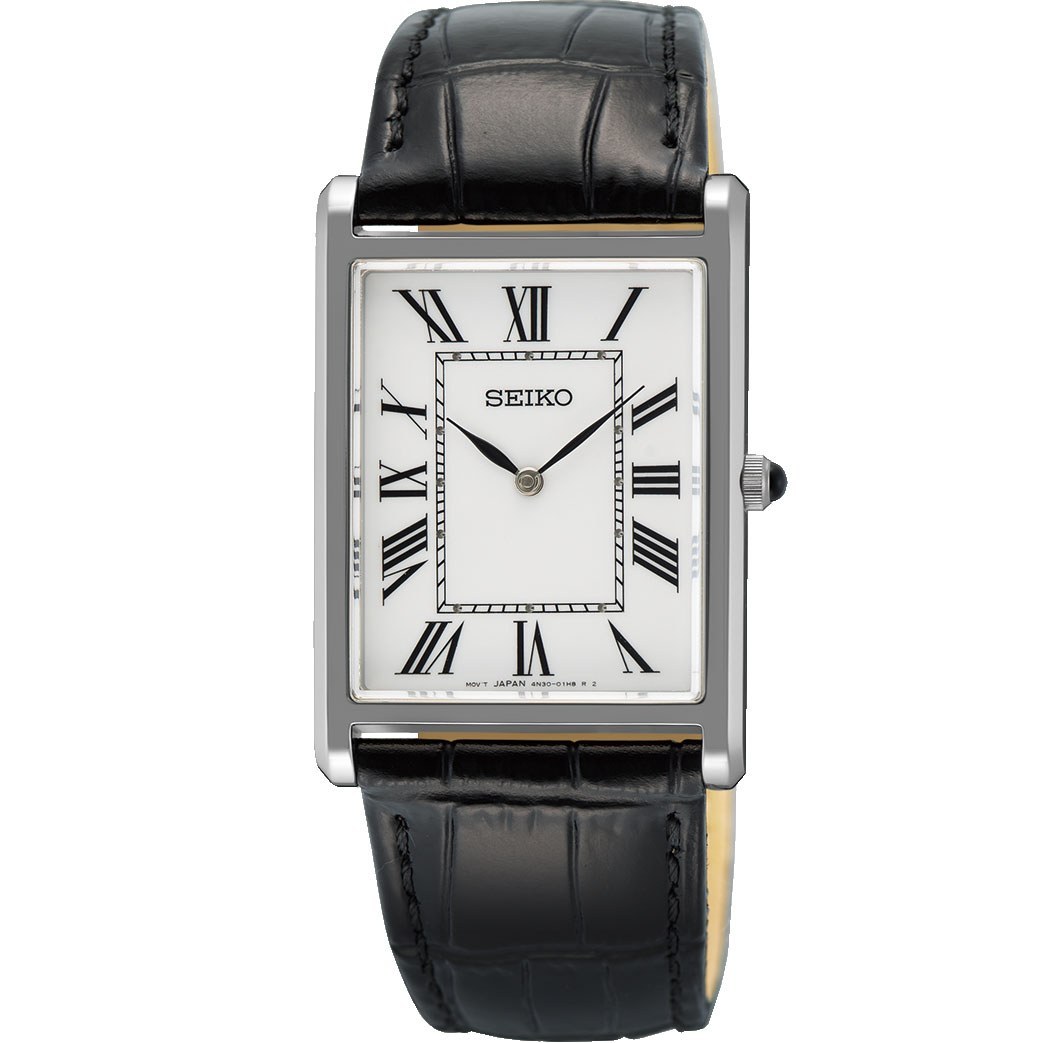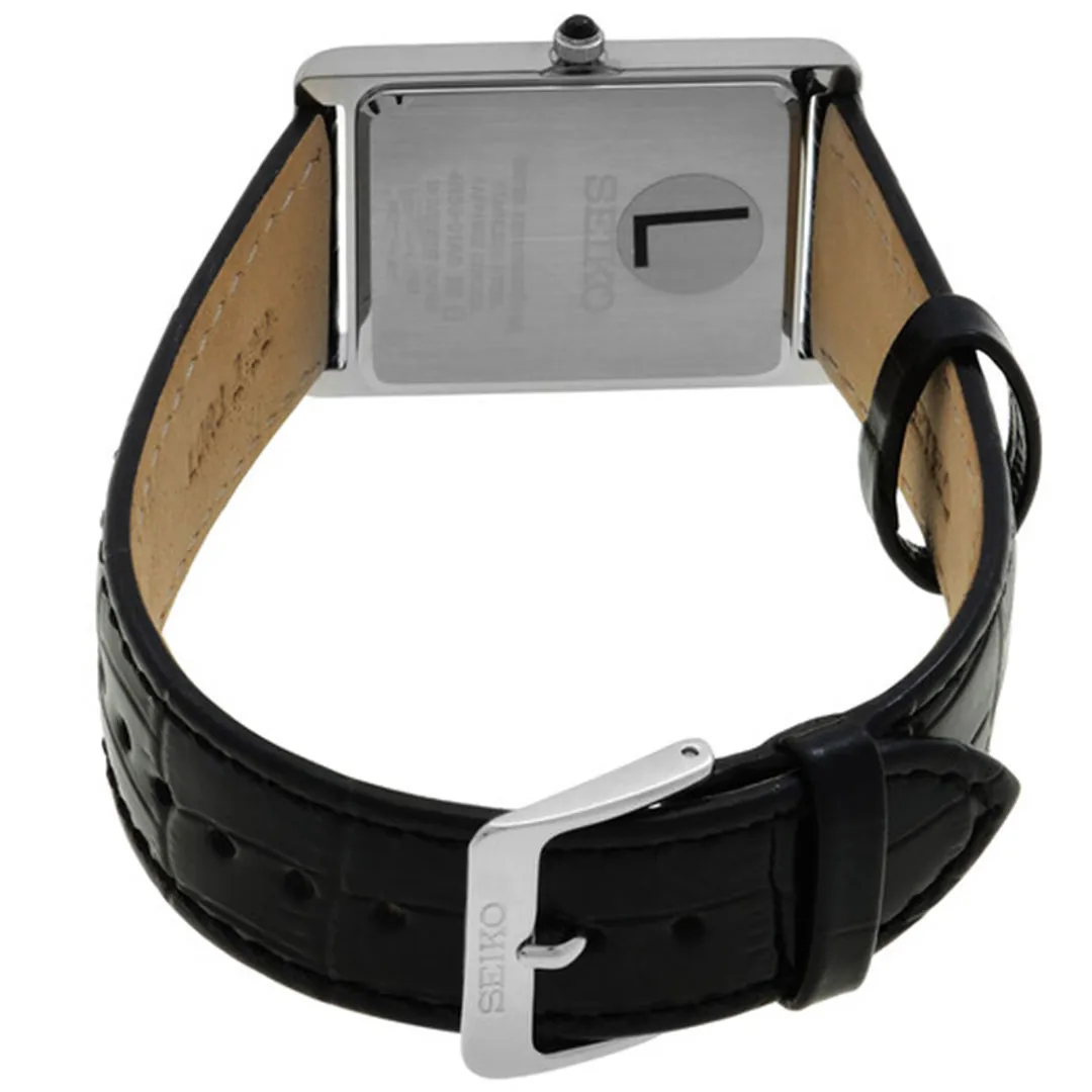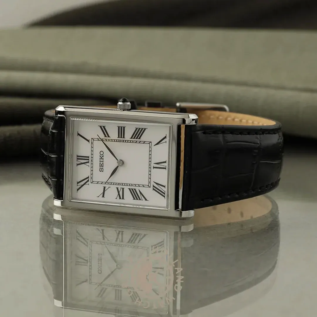 ساعت سیکو مدل SWR103P1 با طراحی کلاسیک مستطیلی، صفحه سفید و ایندکسهای رومی مشکی، جلوهای مینیمال و شیک دارد. قاب استیل و بند چرمی مشکی، ترکیبی از ظرافت و سادگی را ارائه میدهد. شیشه یاقوت ضد خش، موتور کوارتز دقیق و مقاومت مناسب در برابر آب، این مدل را به انتخابی عالی برای استفاده روزمره و رسمی تبدیل کردهاند