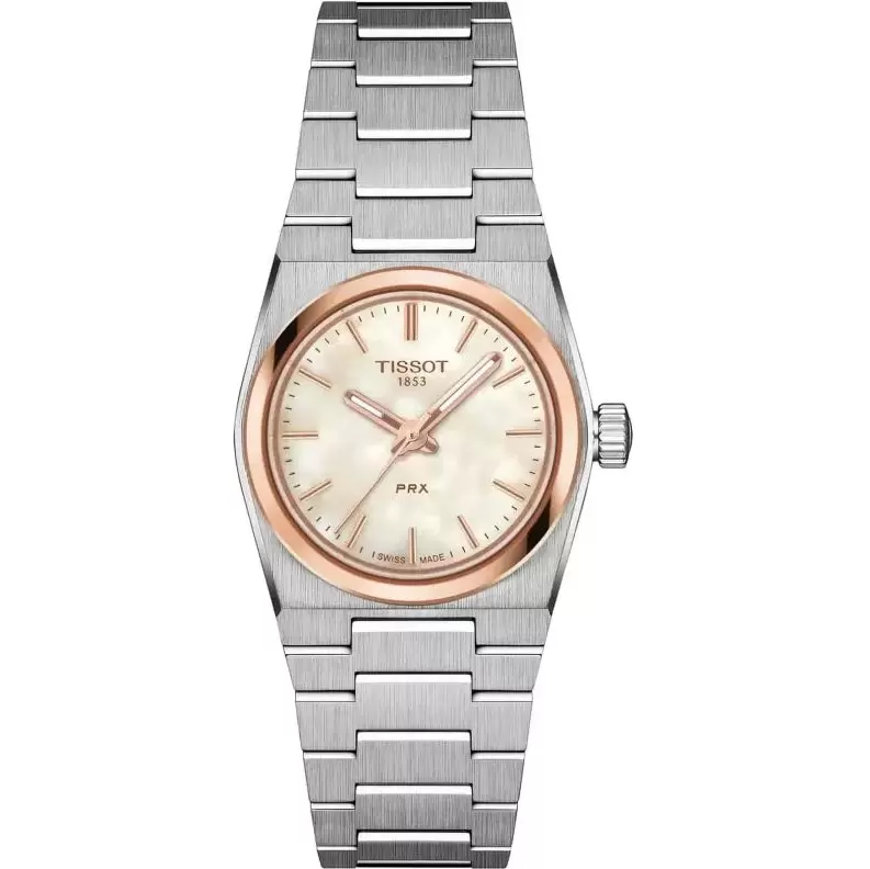مدل T1370102111010 از سری PRX با قطر 25 میلیمتر، یکی از ظریفترین و خاصترین مدلهای تیسوت برای بانوان است. طراحی یکپارچه بند و قاب، صفحه صدفی سفید طبیعی و قاب رزگلد با پوشش PVD، این ساعت را به انتخابی لوکس و چشمنواز تبدیل کرده است.