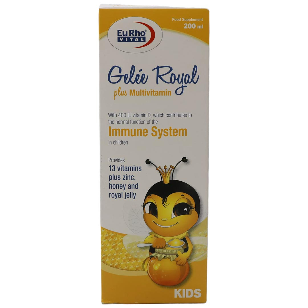 شربت ژل رویال پلاس مولتی ویتامین یوروویتال حاوی رویال ژلی، عسل، بیوتین، روی، فولیک اسید و ویتامین های C، E،A،B1،B2،B3،B5،B6،B12،D3 و K1 است. رویال‌ژلی از فرآورده‌های زنبور عسل است که خواص بسیاری برای تقویت سیستم ایمنی دارد.